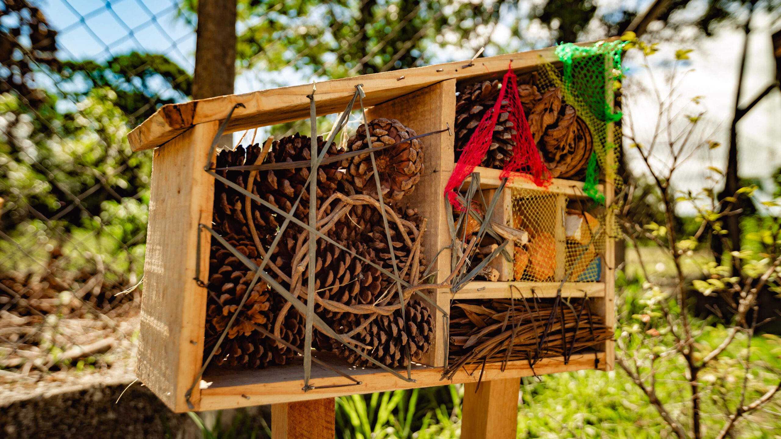 El principio de biodiversidad está presente a través de dispositivos educativos como hoteles de insectos, casitas de pájaros y un banco de semillas.