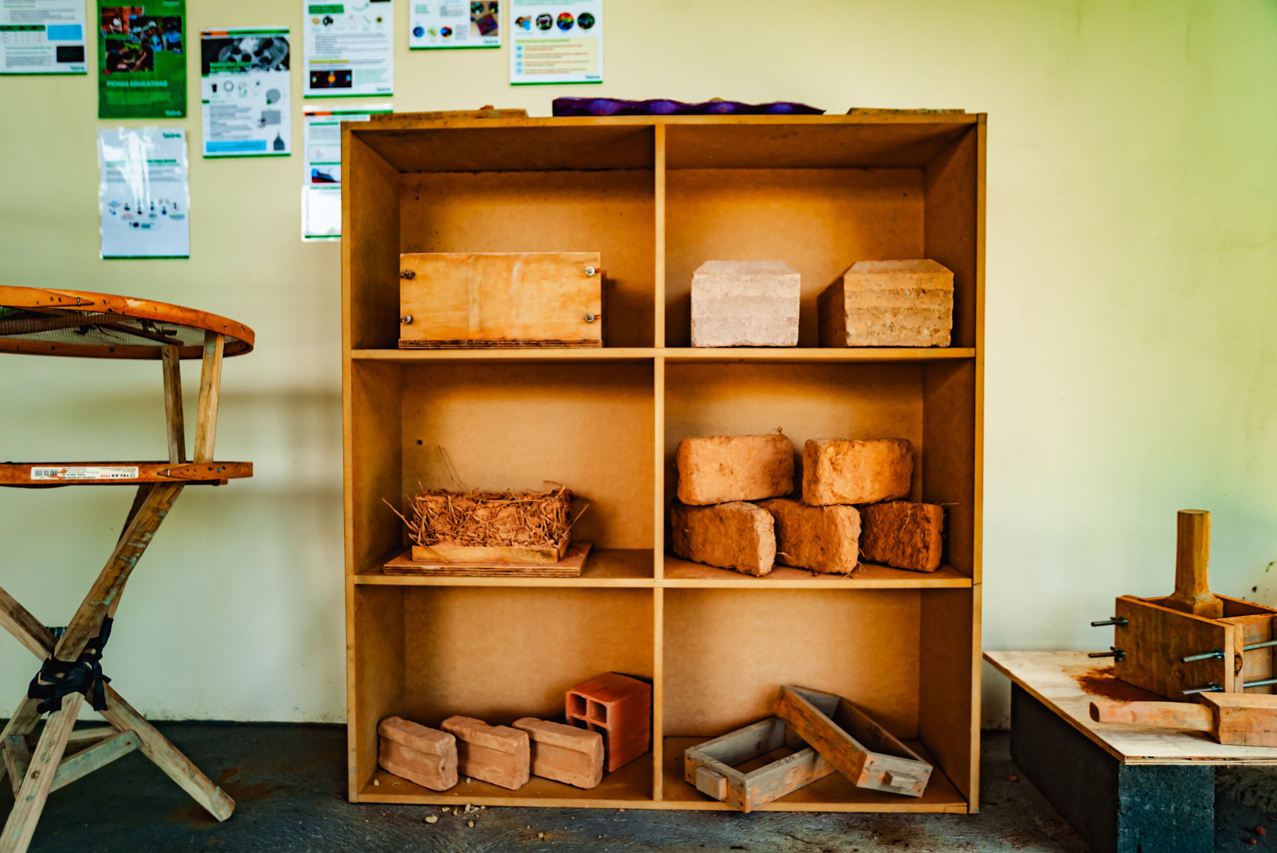 Reutilizamos ventanas de edificios antiguos para los nuevos baños y neumáticos para el parque infantil y paisajismo. Las piezas de madera recuperadas de la construcción de la escuela se reutilizaron para montar canteros en el huerto escolar.