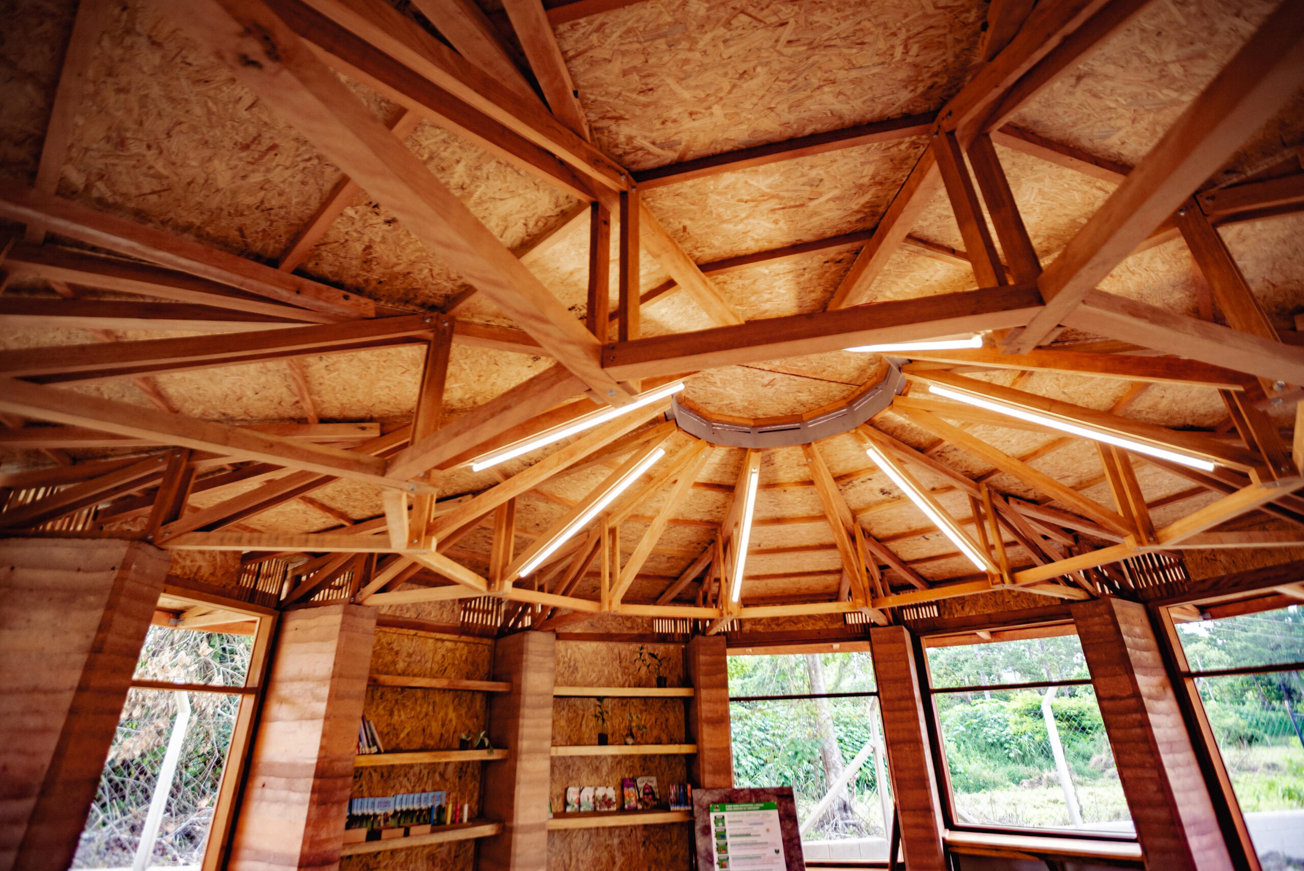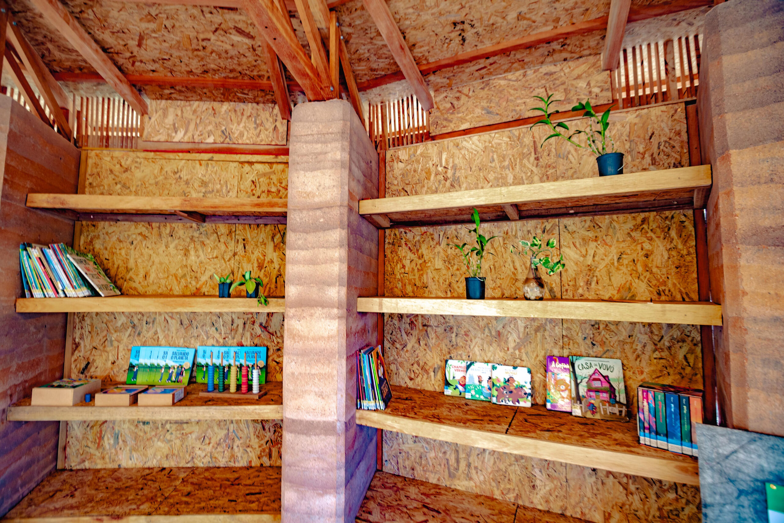 Para el nuevo salón de usos múltiples, se eligió la técnica de taipa, que utiliza paredes de tierra compactada. La estructura del salón consiste en 12 paredes de taipa de 1 metro x 30 cm x 2,20 m de altura, que son autoportantes y sostienen las 12 cerchas de madera conectadas por un anillo central. Los cerramientos y el mobiliario también son de madera.