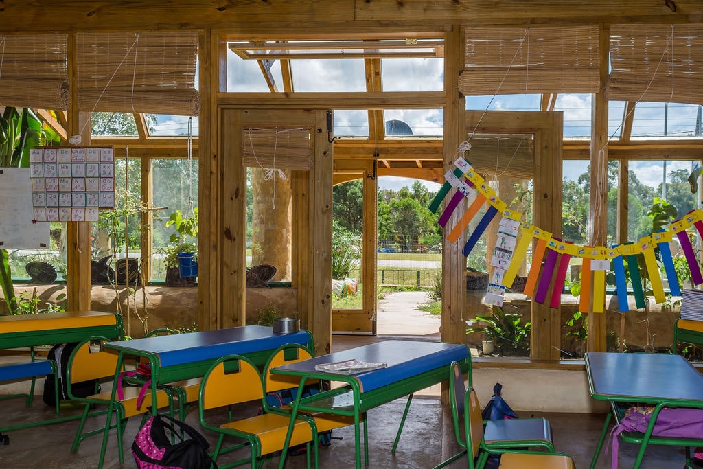 Las paredes sur, este y oeste de la escuela están hechas con neumáticos utilizados a modo de ladrillos, rellenos de tierra y piedras que son luego compactados. Cada uno de estos “ladrillos” pesa aproximadamente 130 kilos.